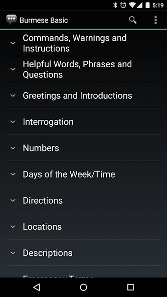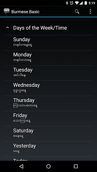 Usando esta aplicación, puede seleccionar una frase en inglés y ver su traducción y cómo pronunciarla en birmano.