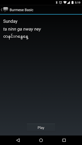 3. En la página de detalles de la frase, la frase birmana se muestra junto con su pronunciación y la frase en inglés equivalente. Presione el botón Reproducir para escuchar la pronunciación de audio por un altavoz nativo.